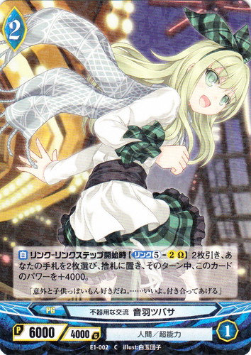 ![]() ![]() | E1-002 不器用な交流 音羽ツバサ プログレス エクストラブースター 第3.5章 少女たちの休日 C 世界:青 種族:人間 分類:超能力 レベル:2 パワー:6000 ガード:4000 ストライク:1 【自】リンク-リンクステップ開始時【リンク⑤-2Ω】2枚引き、あなたの手札を2枚選び、捨札に置き、そのターン中、このカードのパワーを+4000。 「意外と子供っぽいもん好きだね。・・・・・・いいよ。付き合ってあげる」 illust:白玉団子 |