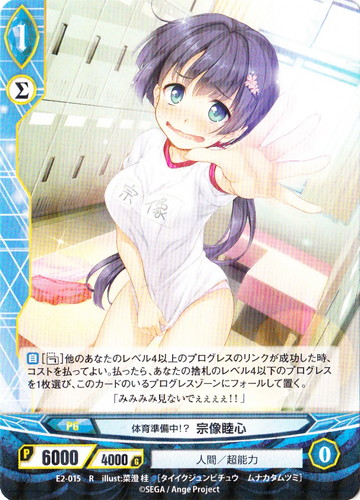 ![]() ![]() | E2-015 体育準備中!? 宗像睦心 プログレス エクストラブースター 第2風紀委員 ガールズバトル R 世界:青 リンク:Σ 種族:人間 分類:超能力 レベル:1 パワー:6000 ガード:4000 【自】[【フォール】]他のあなたのレベル4以上のプログレスのリンクが成功した時、コストを払ってよい。払ったら、あなたの捨札のレベル4以下のプログレスを1枚選び、このカードのいるプログレスゾーンにフォールして置く。 「みみみみ見ないでぇぇぇぇ!!」 illust:菜澄桂 |