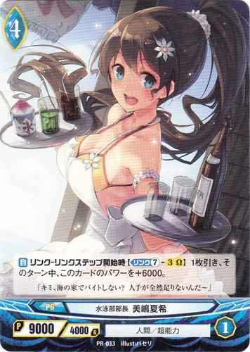 ![]() ![]() | PR-033 水泳部部長 美嶋夏希 プログレス プロモーションカード 世界:青 種族:人間 分類:超能力 レベル:4 パワー:9000 ガード:4000 ストライク:1 【自】リンク-リンクステップ開始時【リンク⑦-3Ω】1枚引き、そのターン中、このカードのパワーを+6000。 「キミ、海の家でバイトしない?人手が全然足りないんだ~」 illust:パセリ |