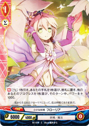 ![]() ![]() | B1-079 小さな妖精 フローリア プログレス ブースターパック 第1章 青蘭の聖少女 C 世界:赤 リンク:Σ 種族:妖精 分類:魔法 レベル:1 パワー:6000 ガード:4000 【起】[フォール]1枚引き、あなたの手札を1枚選び、捨札に置き、他のあなたのプログレスを1枚選び、そのターン中、パワーを+1000。 花から生まれたフローリアにとって、花は仲間であり家族だ。 illust:優木きら |