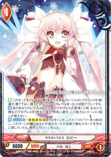 ![]() ![]() | B14-053 蓄積される努力 ルビー プログレス ブースターパック 第14章 三千世界の超越者 C(foil) 世界:赤 種族:妖精 分類:魔法 レベル:3 パワー:9000 ガード:5000 ストライク:1 【自】このカードが登場した時、あなたの捨札のレベル2以上のプログレスを1枚選び、手札に戻してよい。戻していてい、このカードがプログレスのいるプログレスゾーンに登場していたら、あなたの手札を1枚選び、捨てる。 【自】【リンク⑥-ΩΩΩ】そのターン中、このカードのパワーを+6000。 魔法は自由だ。技術次第でなんでもできるはず。 illust:カトーコバヤシ |