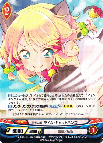 ![]() ![]() | E2-048 王者の爪 ライム・キャットハンズ プログレス エクストラブースター 第2風紀委員 ガールズバトル C 世界:赤 種族:妖精 分類:動物 レベル:2 パワー:6000 ガード:4000 ストライク:1 【自】このカードがプレイされて登場した時、あなたの山札を見て「ライオンキングダム建国」を1枚まで選んで公開し、手札に加え、その山札をシャッフルする。 【自】リンク-リンクステップ開始時【リンク⑤-1ΩΩ】そのターン中、このカードのパワーを+4000。 「ライムの機嫌を損にゃうとガブっといってしまうかもしれんぞ?」 illust:ほなみ彩 |