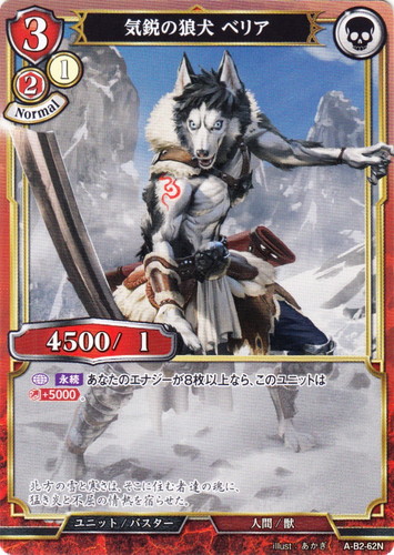![]() ![]() | A-B2-62N 気鋭の狼犬 ベリア ユニット 拡張パック Vol.2 開かれた戦端、交差する宿命 N 色:赤 サブタイプ:バスター コスト:3(赤2/1) パワー:4500 ヒット:1 プレイタイミング:Normal 属性:人間/獣 トリガーアイコン:バスター 【開放時】【永続】あなたのエナジーが8枚以上なら、このユニットはパワー+5000。 北方の雪と寒さは、そこに住む者達の魂に、猛き炎と不屈の情熱を宿らせた。 illust:あかぎ |