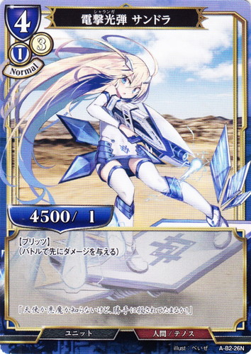 ![]() ![]() | A-B2-26N 電撃光弾 サンドラ ユニット 拡張パック Vol.2 開かれた戦端、交差する宿命 N 色:青 コスト:4(青1/3) パワー:4500 ヒット:1 プレイタイミング:Normal 属性:人間/テノス 【ブリッツ】 (バトルで先にダメージを与える) 「天使か悪魔か知らないけど、勝手に殺されてたまるか!」 illust:べいぜ |