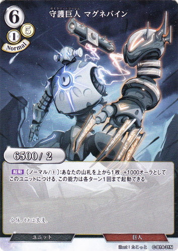![]() ![]() | C-B14-31N 守護巨人 マグネバイン ユニット 拡張パック Vol.14 叫べ、深淵の彼方まで N 色:白 コスト:6(白1/5) パワー:6500 ヒット:2 プレイタイミング:Normal 属性:巨人 【起動】〔ノーマル/[白1]〕:あなたの山札を上から1枚、+1000オーラとしてこのユニットにつける。この能力は各ターン1回まで起動できる。 合体。それは浪漫。 illust:たこっと |