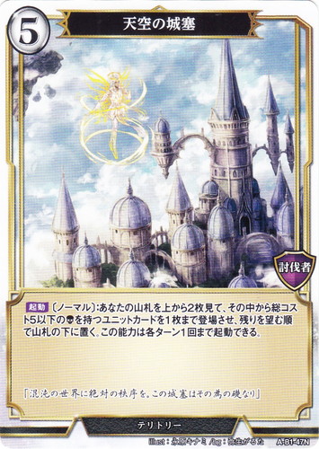 ![]() ![]() | A-B1-47N 天空の城塞 テリトリー 拡張パック Vol.1 果てなき戦乱の序曲 N 色:白 コスト:5 称号:討伐者 【起動】〔ノーマル〕:あなたの山札を上から2枚見て、その中から総コスト5以下の【バスター】を持つユニットカードを1枚まで登場させ、残りを望む順で山札の下に置く。この能力は各ターン1回まで起動できる。 「混沌の世界に絶対の秩序を。この城塞はその為の礎なり」 illust:永原キナミ/bg:弥生がるた/裏面:永原キナミ |