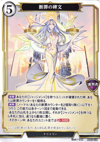 ![]() ![]() | A-B1-48N 審判の神殿 テリトリー 拡張パック Vol.1 果てなき戦乱の序曲 N 色:白 コスト:5 称号:審判者 【自動】このテリトリーが開放された時とあなたのメインフェイズ開始時、あなたの断罪カウンターを2個取り除いてよい。そうしたら、その後、ユニットを1枚対象とし、対象を手札に戻す。 【自動】あなたの【ジャッジメント】を持つユニットが破壊された時、あなたは断罪カウンターを1個得る。 公明正大、真実一路、邪なる罪は一つ残らず裁かれる。 illust:O嬢/裏面:ria |