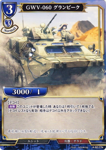 ![]() ![]() | A-B2-27N GWV-060 グランビーク ユニット 拡張パック Vol.2 開かれた戦端、交差する宿命 N 色:青 コスト:3(青3) パワー:3000 ヒット:1 プレイタイミング:Normal 属性:兵器/グラド 【デコイ】 【自動】このユニットが登場した時、あなたは1枚引いて1枚捨てる。 (デコイ:レストなら有効。相手はデコイ以外をアタックできない) 最前線に兵員を輸送し、彼女らを銃弾から守る役目もこなす。 illust:boyaking |