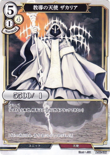![]() ![]() | A-B2-43N 教導の天使 ザカリア ユニット 拡張パック Vol.2 開かれた戦端、交差する宿命 N 色:白 コスト:5(白1/4) パワー:5500 ヒット:1 プレイタイミング:Normal 属性:天使 【デコイ】 (レストなら有効。相手はデコイ以外をアタックできない) 「我らの戦う理由、貴方達にも示してあげましょう」 illust:JKS |