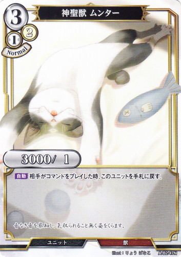 ![]() ![]() | A-B2-47N 神聖獣 ムンター ユニット 拡張パック Vol.2 開かれた戦端、交差する宿命 N 色:白 コスト:3(白1/2) パワー:3000 ヒット:1 プレイタイミング:Normal 属性:獣 【自動】相手がコマンドをプレイした時、このユニットを手札に戻す。 音なき音を察知し、気取られること無く姿をくらます。 illust:りょう ぱなこ |