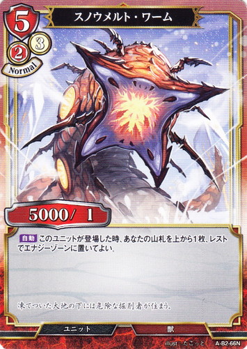![]() ![]() | A-B2-66N スノウメルト・ワーム ユニット 拡張パック Vol.2 開かれた戦端、交差する宿命 N 色:赤 コスト:5(赤2/3) パワー:5000 ヒット:1 プレイタイミング:Normal 属性:獣 【自動】このユニットが登場した時、あなたの山札を上から1枚、レストでエナジーゾーンに置いてよい。 凍てついた大地の下には危険な掘削者が住まう。 illust:たこっと |