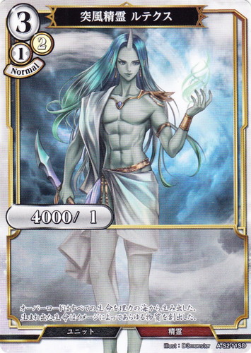 ![]() ![]() | A-S2-11SD 突風精霊 ルテクス ユニット スターティングデッキ Vol.2 紅蓮に猛る獣王 SD 色:白 コスト:3(白1/2) パワー:4000 ヒット:1 プレイタイミング:Normal 属性:精霊 オーバーロードはすべての生命を理力の海から生み出した。 生まれ出た生命はイメージによってあらゆる物質を創出した。 illust:D3monster |
