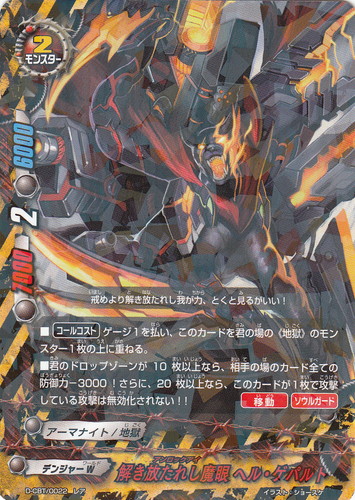 ![]() ![]() | D-CBT/0022 解き放たれし魔眼 ヘル・ゲパルト モンスター DDD クライマックスブースター ドラゴンファイターズ レア ワールド:デンジャーW 属性:アーマナイト/地獄 サイズ:2 攻撃力:7000 防御力:6000 打撃力:2 ■【コールコスト】ゲージ1を払い、このカードを君の場の《地獄》のモンスター1枚の上に重ねる。 ■君のドロップゾーンが10枚以上なら、相手の場のカード全ての防御力-3000!さらに、20枚以上なら、このカードが1枚で攻撃している攻撃は無効化されない!! 【移動】【ソウルガード】 戒めより解き放たれし我が力、とくと見るがいい! イラスト:ショースケ |