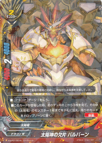 ![]() ![]() | X-CP01/0075 太陽神の欠片 バルバーン モンスター バッツ キャラクターパック 第1弾 めっちゃ!!100円ドラゴン シークレット ワールド:ドラゴンW 属性:太陽竜 サイズ:2 攻撃力:4000 防御力:4000 打撃力:2 ■【コールコスト】ゲージ1を払う。 ■このカードが登場した時、君のデッキの上から3枚を見て、その中の《太陽竜》のモンスター1枚までを手札に加え、残りのカードをドロップゾーンに置く。 【移動】 彼らは遠方で魔竜の眷属と対峙し、陰ながら太陽神を支援していた。 イラスト:ショースケ |