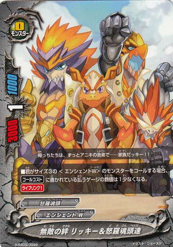 ![]() ![]() | X-SS03/0039 無敵の絆 リッキー&怒羅魂頭達 モンスター バッツ スペシャルシリーズ 第3弾 5WORLD BUILD MASTERS ワールド:エンシェントW 属性:怒羅魂頭 サイズ:0 攻撃力:3000 防御力:1000 打撃力:1 ■君がサイズ3の<エンシェントW>のモンスターをコールする場合、【コールコスト】に書かれている払うゲージの数値は1少なくなる。 【ライフリンク1】 俺っちたちは、ずっとアニキの舎弟で・・・・・・家族だッキー!! イラスト:ショースケ |