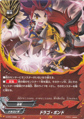 ![]() ![]() | X-CP01/0066 ドラゴ・ボンド 魔法 バッツ キャラクターパック 第1弾 めっちゃ!!100円ドラゴン 上 ワールド:ドラゴンW 属性:金竜 ■君のセンターにモンスターがいないなら使える。 ■【対抗】君の場のモンスター1枚を選ぶ。そのターン中、次にそのモンスターが破壊される場合、君のライフを+2し、そのモンスターを場に残せる。 否定することもある。ぶつかることもある。絆の深め方は、人それぞれだ。 イラスト:yazwo |