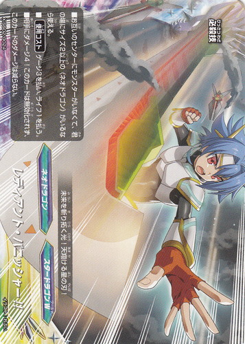 ![]() ![]() | X-SS02/0024 レディアント・パニッシャー!! 必殺技 バッツ スペシャルシリーズ 第2弾 レディアント・エヴォリューションVS断罪 煉獄騎士団 ワールド:スタードラゴンW 属性:ネオドラゴン ■お互いのセンターにモンスターがいなくて、君の場にサイズ2以上の《ネオドラゴン》がいるなら使える。 ■【使用コスト】ゲージ3を払い、ライフ1を払う。 ■相手にダメージ4!このカードは無効化されず、このカードのダメージは減らない。 未来を切り拓く星の刃よ!今再び、天を翔けろ! イラスト:yazwo |