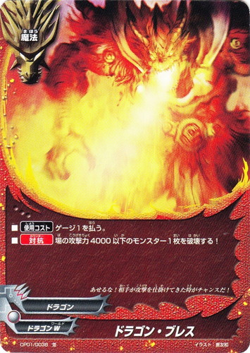 ![]() ![]() | CP01/0038 ドラゴン・ブレス 魔法 キャラクターパック 第1弾 100円ドラゴン 並 ワールド:ドラゴンW 属性:ドラゴン ■【使用コスト】ゲージ1を払う。 ■【対抗】場の攻撃力4000以下のモンスター1枚を破壊する! あせるな!相手が攻撃を仕掛けてきた時がチャンスだ! イラスト:原友和 |