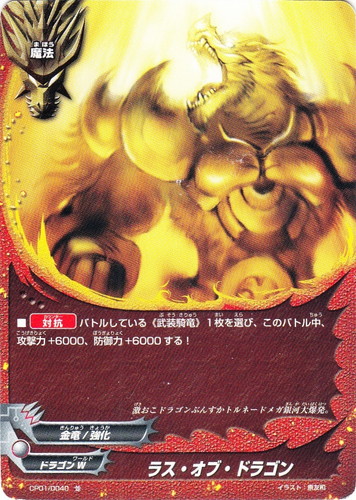 ![]() ![]() | CP01/0040 ラス・オブ・ドラゴン 魔法 キャラクターパック 第1弾 100円ドラゴン 並 ワールド:ドラゴンW 属性:金竜/強化 ■【対抗】バトルしている《武装騎竜》1枚を選び、このバトル中、攻撃力+6000、防御力+6000する! 激おこドラゴンぶんすかトルネードメガ銀河大爆発。 イラスト:原友和 |