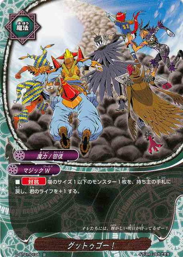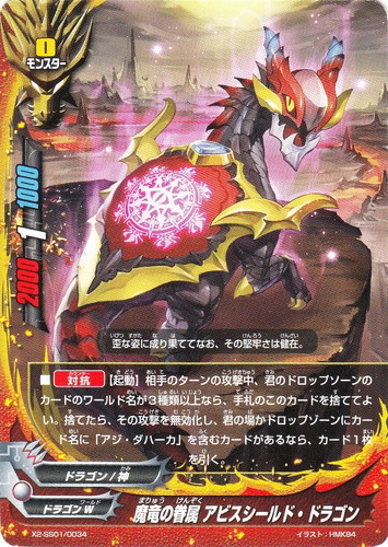 ![]() ![]() | PR/0269 超激突!デュエルイェーガー モンスター プロモーションカード ワールド:エンシェントW 属性:竜王番長 サイズ:3 攻撃力:10000 防御力:7000 打撃力:3 ■【コールコスト】ゲージ3を払い、君のドロップゾーンの《竜王番長》2枚をこのカードのソウルに入れる。 ■【対抗】【起動】このカードのソウル1枚をドロップゾーンに置いてよい。置いたら、そのターン中、このカードの攻撃力を+10000、打撃力+1! 【貫通】【ソウルガード】 小さな太陽竜の大きな野望に、武神は拳を振るい、全力で応える! イラスト:ショースケ/デザイン:タカヤマトシアキ |