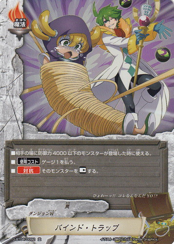 ![]() ![]() | BT03/0101 モンスターマスターの杖 アレルタ アイテム ブースターパック 第3弾 ドドド大冒険 並(foil) ワールド:ダンジョンW 属性:杖 攻撃力:0 打撃力:0 ■【装備コスト】ゲージ2を払う。 ■【対抗】【起動】このカードを「レスト」にしてよい。「レスト」にしたら、バトルしている《Dエネミー》1枚を選び、このバトル中、攻撃力+2000、防御力+2000し、さらに【反撃】を与える。 我がしもべ達よ、あの身の程知らずどもを盛大にもてなせ! イラスト:みがお |