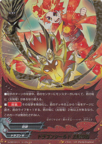 ![]() ![]() | S-CR/0012 ドラゴンシールド 古竜の盾 魔法 2018年コロコロコミック7月号 ガルガBOX ワールド:ドラゴンW 属性:ドラゴン/防御 ■君が攻撃されている攻撃中に使える。 ■【対抗】その攻撃を無効化し、君のライフが1ならカード1枚を引く。 相手が勝ったと思った時に攻撃を防ぐカードを使おう。 最高にカッコイイタイミングだ。 イラスト:藤原ひさし |