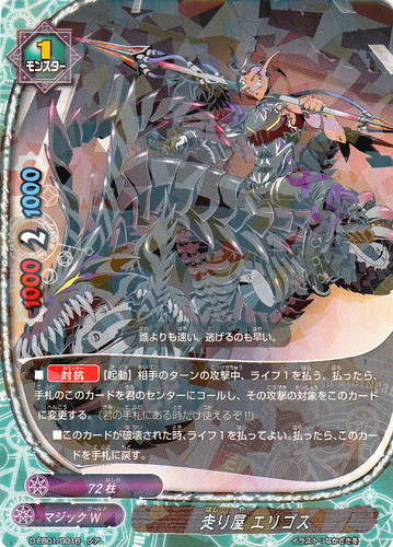 ![]() ![]() | X-CP01/0001 武装騎神 エネルゲイア モンスター バッツ キャラクターパック 第1弾 めっちゃ!!100円ドラゴン 超ガチレア ワールド:ドラゴンW 属性:武装騎竜/神 サイズ:3 攻撃力:10000 防御力:9000 打撃力:2 ■【コールコスト】君のデッキの上から2枚をこのカードのソウルに入れ、ゲージ5を払う。 ■アタックフェイズ中、相手の場のカード全ての能力を無効化する。この能力は無効化されない。 ■このカードはレフトとライトに攻撃できず、このカードが1枚で攻撃しているバトル中、相手は【対抗】を使えない。 【移動】【2回攻撃】【ソウルガード】 武人にして、竜にして、神なる者に与えられし称号、それが武装騎神。 イラスト:lack |