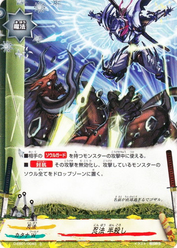 ![]() ![]() | BT05/0043 秘剣 明星 必殺技 ブースターパック 第5弾 煉獄ナイツ レア ワールド:カタナW 属性:忍法/秘剣 ■相手の場の攻撃力3000以下のモンスターが1枚で君を攻撃している攻撃中、このカードがカード名に「秘剣」を含むカードのソウルにあるなら使える。(このカードは手札から使えない) ■【使用コスト】ゲージ3を払う。 ■【対抗】そのモンスターを破壊し、相手にダメージ3! 志あらば、迷いは無い。それは、闇に輝く明星のごとく。 イラスト:Quily |