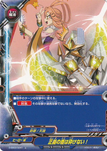 ![]() ![]() | S-UB06/0039 バールサンダー×ハイガード 魔法 神バディファイト アルティメットブースター 第6弾 バディアゲインVol.3~現役!GREAT・オーバーエイジ~ 上 ワールド:ドラゴンW 属性:雷帝軍/防御 ■相手のターンの攻撃中に使える。 ■【対抗】その攻撃を無効化する。さらに、君の場にカード名に「雷陽」を含むカードがあるなら、君のドロップのカード名に「ドラゴンシールド」を含む魔法1枚までを手札に加える。 危ねぇ危ねぇ・・・! イラスト:ip |