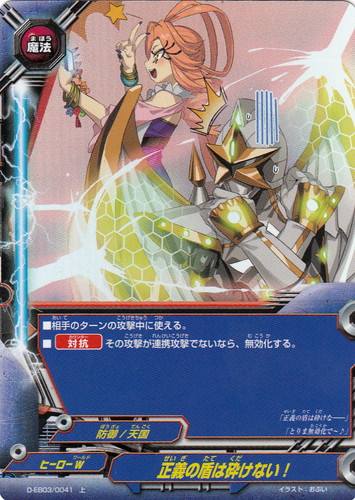 ![]() ![]() | BT04/0061 アキレウスの盾 魔法 ブースターパック 第4弾 轟斬轟く!! 上 ワールド:レジェンドW 属性:オリンピア/防御 ■君がダメージを受ける時に使える。 ■【対抗】そのダメージを2減らす。 英雄の盾には、世界そのものが描かれているという。 イラスト:藤原ひさし |
