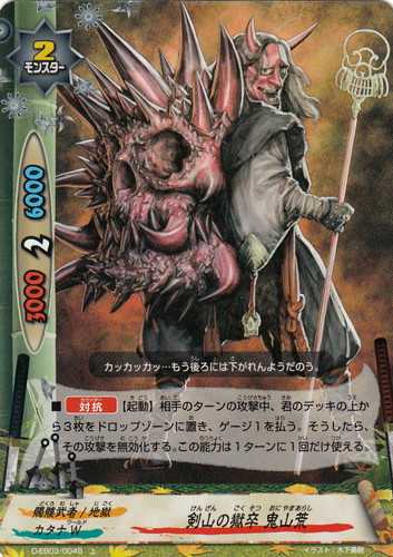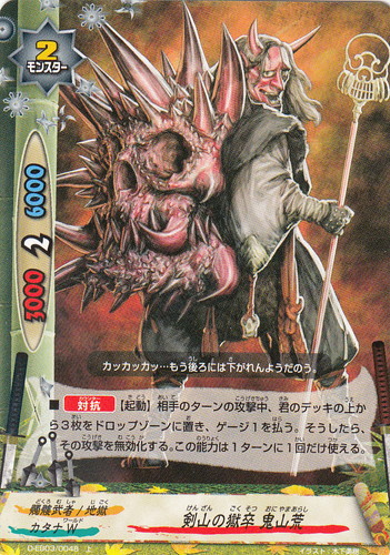 ![]() ![]() | H-SS01/0022 炎魔連合総長 バーンノヴァ モンスター ハンドレッド スペシャルシリーズ 第1弾 ゲキ強!!バディレアトリプルデッキ ワールド:エンシェントW 属性:怒羅魂頭 サイズ:3 攻撃力:9000 防御力:7000 打撃力:3 【角王】 ■【コールコスト】ゲージ2を払う。 ■【対抗】【起動】君の手札の《怒羅魂頭》のモンスター1枚を捨ててよい。捨てたら、そのターン中、このカードは捨てたカードに書かれている能力全てを得る。この能力は1ターンに1回だけ使える。 【貫通】【ライフリンク5】 泣く子がさらに泣き喚く!炎魔連合の頭たぁ俺のことだッ! イラスト:タカヤマトシアキ |