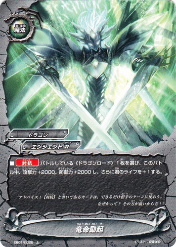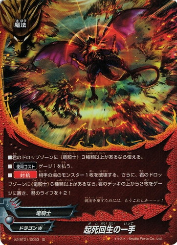 ![]() ![]() | EB01/0026 竜命励起 魔法 エクストラブースター 第1弾 不死身の竜神 上 ワールド:エンシェントW 属性:ドラゴン ■【対抗】バトルしている《ドラゴンロード》1枚を選び、このバトル中、攻撃力+2000、防御力+2000し、さらに君のライフを+1する。 アドバイス!【対抗】と書いてあるカードは、できるだけ相手のターンに使おう。なぜかって?その方が強いからさ! イラスト:安達洋介 |