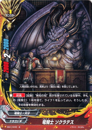 ![]() ![]() | EB01/0030 竜騎士 ソクラテス モンスター エクストラブースター 第1弾 不死身の竜神 並 ワールド:ドラゴンW 属性:竜騎士/天才 サイズ:1 攻撃力:2000 防御力:2000 打撃力:2 ■【対抗】【起動】”無知の知” 君がコウゲキされている攻撃中、手札の《竜騎士》1枚を捨て、ライフ1を払ってよい。そうしたら、その攻撃を無効化する。 人間は弱いからね。真実より「面白い嘘」を信じてしまう。 イラスト:かにぱん |