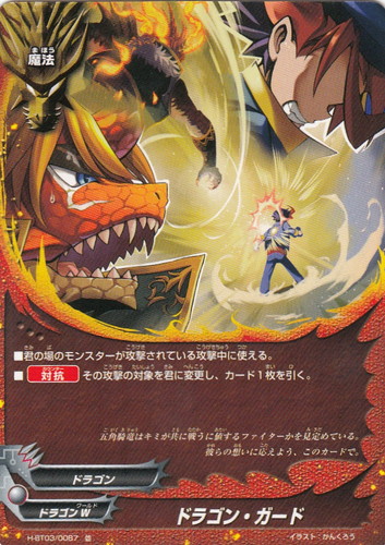 ![]() ![]() | H-BT03/0087 ドラゴン・ガード 魔法 ハンドレッド ブースターパック 第3弾 角王大出陣!! 並 ワールド:ドラゴンW 属性:ドラゴン ■君の場のモンスターが攻撃されている攻撃中に使える。 ■【対抗】その攻撃の対象を君に変更し、カード1枚を引く。 五角騎竜はキミが共に戦うに値するファイターかを見定めている。 彼らの想いに応えよう、このカードで。 イラスト:かんくろう |