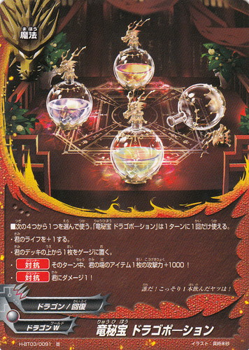 ![]() ![]() | H-BT03/0091 竜秘宝 ドラゴポーション 魔法 ハンドレッド ブースターパック 第3弾 角王大出陣!! 並(foil) ワールド:ドラゴンW 属性:ドラゴン/回復 ■次の4つから1つを選んで使う。「竜秘宝 ドラゴポーション」は1ターンに1回だけ使える。 ・君のライフを+1する。 ・君のデッキの上から1枚をゲージに置く。 ・【対抗】そのターン中、君の場のアイテム1枚の攻撃力+1000! ・【対抗】君にダメージ1! 誰だ!こっそり1本飲んだヤツは! イラスト:真時未砂 |