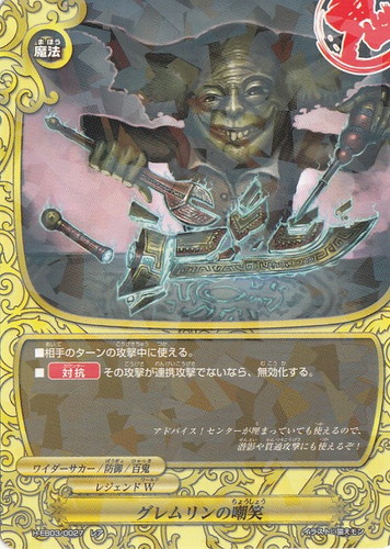 ![]() ![]() | H-SS01/0020 五角天技 ギガハウリング・ファントム!! 必殺技 ハンドレッド スペシャルシリーズ 第1弾 ゲキ強!!バディレアトリプルデッキ ワールド:ドラゴンW 属性:ドラゴン ■君が攻撃されている攻撃中、君がアイテムを装備しているなら使える。 ■【使用コスト】ゲージ3を払う。 ■【対抗】その攻撃を無効化し、相手にダメージ2!! まだ、左の拳が残ってるぜぇぇぇッ!! イラスト:なかざき冬 |