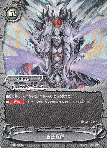 ![]() ![]() | BT01/0023 ナイトエナジー 魔法 ブースターパック 第1弾 ドラゴン番長 レア ワールド:ドラゴンW 属性:竜騎士/強化 ■【対抗】バトルしている《竜騎士》1枚を選び、このバトル中、攻撃力+3000、防御力+3000し、さらに【反撃】を与える! (【反撃】:このカードが攻撃された後、このカードが場にいるなら、このカードの攻撃力以下の防御力を持つ攻撃したモンスター1枚を破壊する) イラスト:長崎祐子 |