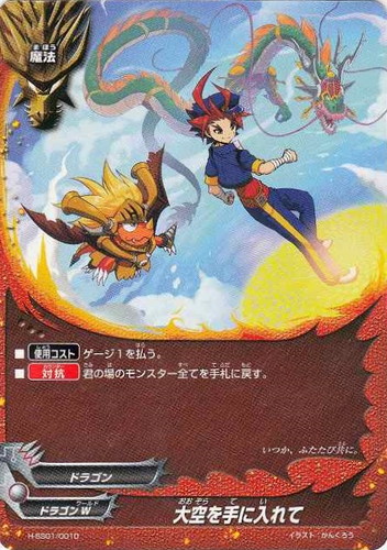 ![]() ![]() | H-SS01/0010 大空を手に入れて 魔法 ハンドレッド スペシャルシリーズ 第1弾 ゲキ強!!バディレアトリプルデッキ ワールド:ドラゴンW 属性:ドラゴン ■【使用コスト】ゲージ1を払う。 ■【対抗】君の場のモンスター全てを手札に戻す。「大空を手に入れて」は1ターンに1回だけ使える。 いつか、ふたたび共に。 イラスト:かんくろう |