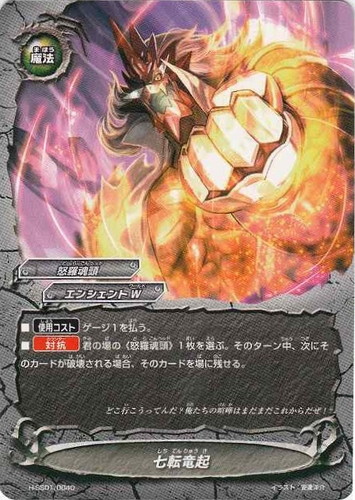 ![]() ![]() | H-SS01/0040 七転竜起 魔法 ハンドレッド スペシャルシリーズ 第1弾 ゲキ強!!バディレアトリプルデッキ ワールド:エンシェントW 属性:怒羅魂頭 ■【使用コスト】ゲージ1を払う。 ■【対抗】君の場の《怒羅魂頭》1枚を選ぶ。そのターン中、次にそのカードが破壊される場合、そのカードを場に残せる。 どこ行こうってんだ?俺たちの喧嘩はまだまだこれからだぜ! イラスト:安達洋介 |