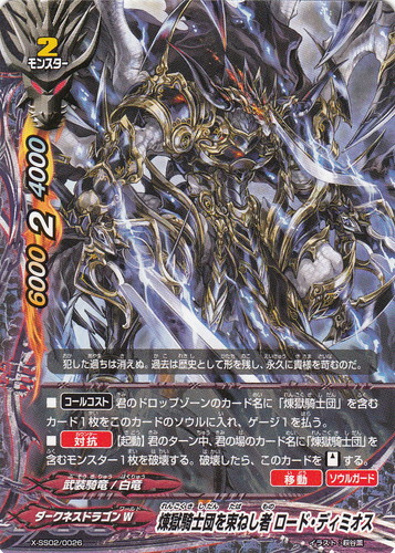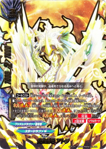 ![]() ![]() | X-TD03/0001 逆天の雷竜 バールバッツ モンスター バッツ トライアルデッキ 第3弾 轟天の覇王軍 ワールド:ドラゴンW 属性:雷帝軍/ドラゴン サイズ:2 攻撃力:7000 防御力:4000 打撃力:2 ■【コールコスト】ゲージ1を払う。 ■君のターン中、場のこのカードは破壊されない。 ■【逆天】〔君のアタックフェイズ中、ゲージ1を払う〕君の場の《雷帝軍》1枚とこのカードをスタンドする。(【逆天】はファイト中に1回だけ使える。この能力は無効化されず、【逆天】に対して、相手は【対抗】できない) 【2回攻撃】 新生した雷帝軍の力、見せてやろう! イラスト:安達洋介 |
