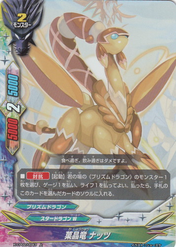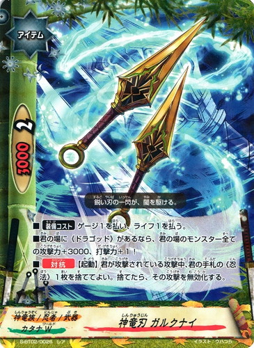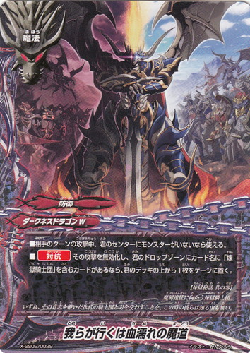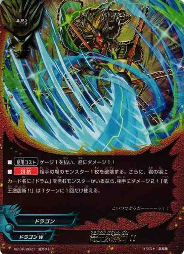 ![]() ![]() | X-CBT01/0070 轟天覇王竜 バールバッツ・ドラグロイヤー モンスター バッツ クライマックスブースター 第1弾 最強バッツ覚醒!~赤き雷帝~ シークレット ワールド:ドラゴンW 属性:雷帝軍/ドラゴン サイズ:3 攻撃力:∞ 防御力:7000 打撃力:2 ■【コールコスト】君の場のカード名に「バッツ」を含むモンスター1枚をドロップゾーンに置く。 ■君のターン中、場のこのカードは破壊されず、相手のカードの効果で、レストされず、能力は無効化されない。 【大逆天】〔君のアタックフェイズ開始時、ゲージ3を払い、手札1枚を捨てる〕そのターン中、このカードは【6回攻撃】を得る!!!(【大逆天】はファイト中に1回だけ使える。この能力は無効化されず、【大逆天】に対して、相手は【対抗】できない) 【2回攻撃】 魔王も雷帝も凌ぐ最強の覇王――轟天覇王竜、ここに降臨! イラスト:安達洋介 |