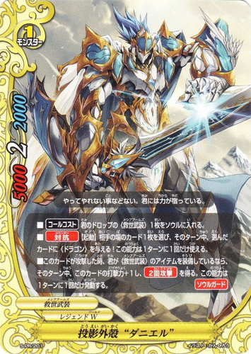 ![]() ![]() | S-PR/201 投影外殻 ”ダニエル” モンスター プロモーションカード(神・バディファイト) ワールド:レジェンドW 属性:救世武装 サイズ:1 攻撃力:5000 防御力:2000 打撃力:2 ■【コールコスト】君のドロップの《救世武装》1枚をソウルに入れる。 ■【対抗】【起動】相手の場のカード1枚を選び、そのターン中、選んだカードに《ドラゴン》を与える!この能力は1ターンに1回だけ使える。 ■このカードが攻撃した時、君が《救世武装》のアイテムを装備しているなら、そのターン中、このカードの打撃力*+1し、【2回攻撃】を得る。この能力は1ターンに1回だけ発動する。 【ソウルガード】 やってやれない事などない。君には力が宿っている。 イラスト:かんくろう |