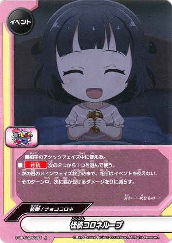 ![]() ![]() | S-UB-C02/0053 怪談コロネループ イベント 神バディファイト アルティメットブースタークロス 第2弾 BanG Dream! ガルパ☆ピコ 上 ワールド:BanG Dream! ガルパ☆ピコ 属性:防御/チョココロネ ■相手のアタックフェイズ中に使える。 ■【対抗】次の2つから1つを選んで使う。 ・次の君のメインフェイズ終了時まで、相手はイベントを使えない。 ・そのターン中、次に君が受けるダメージを0に減らす。 何か・・・・・・飲むもの・・・・・・ 作品名:BanG Dream! ガルパ☆ピコ |