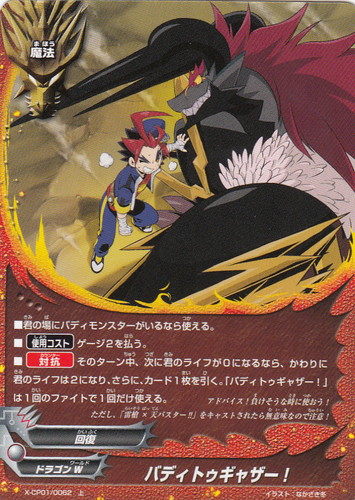 ![]() ![]() | X-CBT01/BR01 轟天覇王竜 バールバッツ・ドラグロイヤー モンスター バッツ クライマックスブースター 第1弾 最強バッツ覚醒!~赤き雷帝~ バディレア ワールド:ドラゴンW 属性:雷帝軍/ドラゴン サイズ:3 攻撃力:∞ 防御力:7000 打撃力:2 ■【コールコスト】君の場のカード名に「バッツ」を含むモンスター1枚をドロップゾーンに置く。 ■君のターン中、場のこのカードは破壊されず、相手のカードの効果で、レストされず、能力は無効化されない。 【大逆天】〔君のアタックフェイズ開始時、ゲージ3を払い、手札1枚を捨てる〕そのターン中、このカードは【6回攻撃】を得る!!!(【大逆天】はファイト中に1回だけ使える。この能力は無効化されず、【大逆天】に対して、相手は【対抗】できない) 【2回攻撃】 相棒、か・・・・・・いい響きだ。今なら全力を出し切れる! イラスト:安達洋介 |