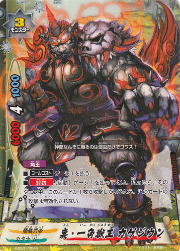 ![]() ![]() | H-SS01/0022 炎魔連合総長 バーンノヴァ モンスター ハンドレッド スペシャルシリーズ 第1弾 ゲキ強!!バディレアトリプルデッキ (パラレル) ワールド:エンシェントW 属性:怒羅魂頭 サイズ:3 攻撃力:9000 防御力:7000 打撃力:3 【角王】 ■【コールコスト】ゲージ2を払う。 ■【対抗】【起動】君の手札の《怒羅魂頭》のモンスター1枚を捨ててよい。捨てたら、そのターン中、このカードは捨てたカードに書かれている能力全てを得る。この能力は1ターンに1回だけ使える。 【貫通】【ライフリンク5】 泣く子がさらに泣き喚く!炎魔連合の頭たぁ俺のことだッ! イラスト:タカヤマトシアキ |
