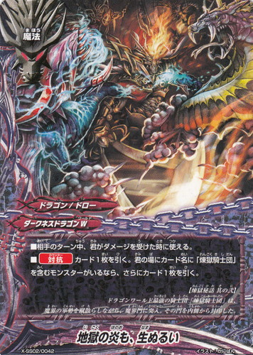 ![]() ![]() | D-EB03/0004 ガガルガリオス “焦炎獄熱魔波!” 必殺モンスター DDD エクストラブースター 第3弾 HEAVEN&HELL 超ガチレア ワールド:ダークネスドラゴンW 属性:黒竜/地獄 サイズ:3 攻撃力:12000 防御力:5000 打撃力:5 ■【コールコスト】ゲージ3を払い、君の場のモンスターか「裁きの門 -ジャッジメント-」1枚をドロップゾーンに置く。 ■このカードが登場した時、君か相手のドロップゾーンが20枚以上なら、相手の場のモンスター全てを破壊する。 ■このカードが1枚で攻撃しているバトル中、君か相手のドロップゾーンが30枚以上なら、相手は【対抗】を使えない。 幾千、幾万、幾憶、幾兆、幾京!何度でも死をくれてやろう! イラスト:ショースケ |