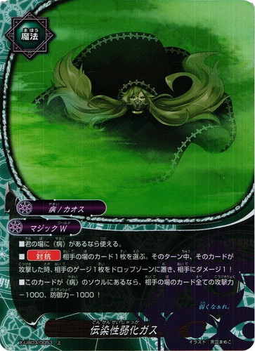 ![]() ![]() | S-UB-C04/0056 妖花の記憶 イベント 神バディファイト アルティメットブースタークロス 第4弾 ゲゲゲの鬼太郎 上 ワールド:ゲゲゲの鬼太郎 属性:防御 ■相手のターンの攻撃中に使える。 ■【対抗】その攻撃を無効化する。さらに、君の場に属性に「妖怪」を含むカード2種類以上があるなら、君のデッキの上から1枚をゲージに置き、君のライフを+1し、カード1枚を引く。 まな「赤い花こんな所から・・・・・・」 作品名:ゲゲゲの鬼太郎 |