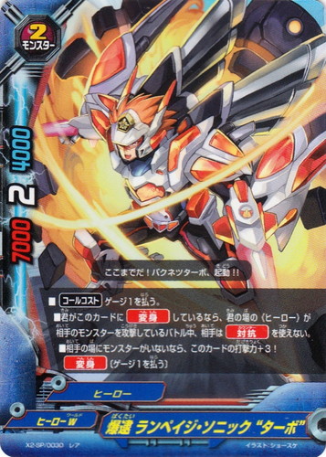 ![]() ![]() | X2-SP/0030 爆逮 ランペイジ・ソニック “ターボ” モンスター バッツ オールスターファイト スペシャルパック ファイナル番長 レア ワールド:ヒーローW 属性:ヒーロー サイズ:2 攻撃力:7000 防御力:4000 打撃力:2 ■【コールコスト】ゲージ1を払う。 ■君がこのカードに【変身】しているなら、君の場の《ヒーロー》が相手のモンスターを攻撃しているバトル中、相手は【対抗】を使えない。 ■相手の場にモンスターがいないなら、このカードの打撃力+3! 【変身】〔ゲージ1を払う〕 ここまでだ!バクネツターボ、起動!! イラスト:ショースケ |