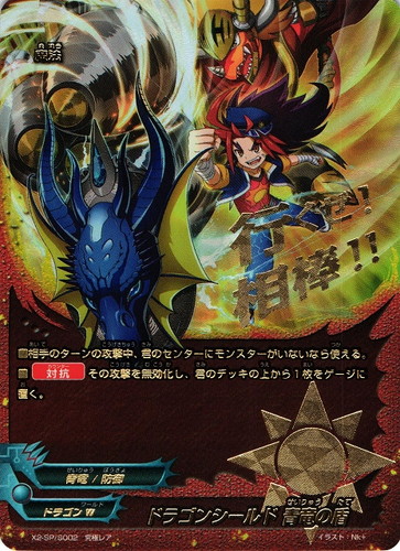![]() ![]() | H-SS01/0011 ドラゴンシールド 青竜の盾 魔法 ハンドレッド スペシャルシリーズ 第1弾 ゲキ強!!バディレアトリプルデッキ ワールド:ドラゴンW 属性:青竜/防御 ■相手のターンの攻撃中、君のセンターにモンスターがいないなら使える。 ■【対抗】その攻撃を無効化し、君のデッキの上から1枚をゲージに置く。 キャスト!ドラゴンシールド 青竜の盾! イラスト:きゃきゃ |