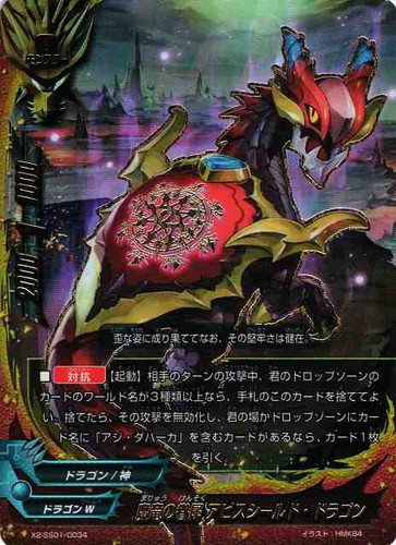 ![]() ![]() | ZD02/0012 ドラゴンシールド 飛竜の盾 魔法 次世代ワールドホビーフェア’15 Winter配布ゲキ厚!!52枚ドラゴンデッキ & 配布パック ワールド:ドラゴンW 属性:ドラゴン/防御 ■君が攻撃によってダメージを受ける時、君のセンターにモンスターがいないなら使える。 ■【使用コスト】ゲージ1を払う。 ■【対抗】そのダメージを0に減らし、君のライフを+1する! 飛竜の盾は導きの翼。敵の攻撃を触れさせぬ。 イラスト:藤原ひさし |